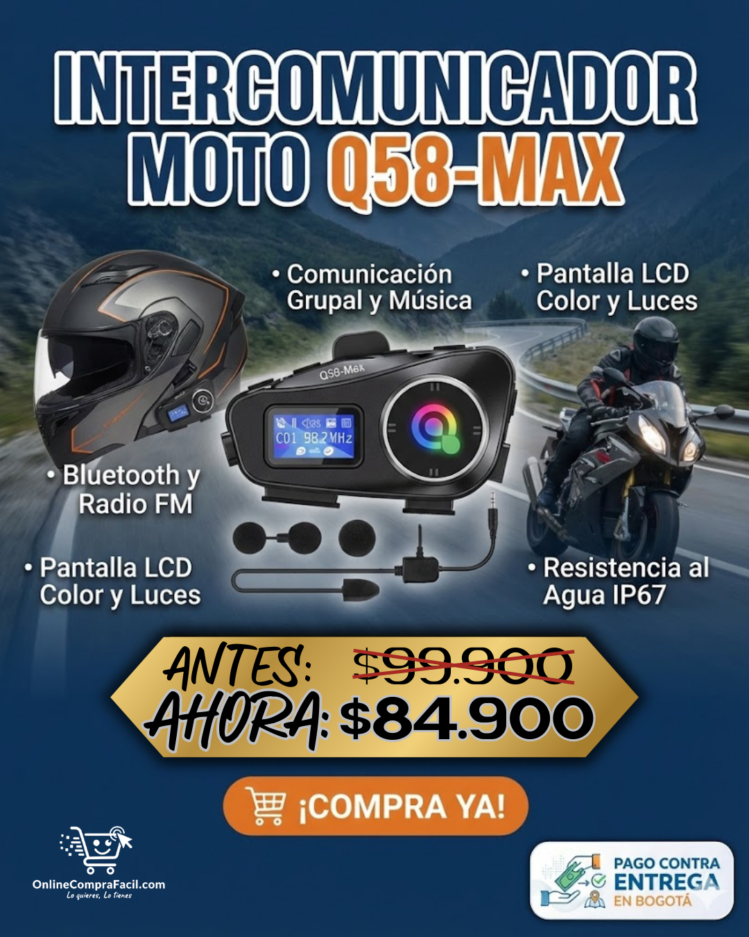 Comunícate con claridad mientras conduces con el intercomunicador Q58 MAX. Diseñado para motociclistas, ofrece conexión estable, audio nítido y fácil instalación en el casco, permitiéndote hablar, escuchar música o recibir indicaciones sin perder la concentración en la vía. Ideal para viajes y uso diario.
