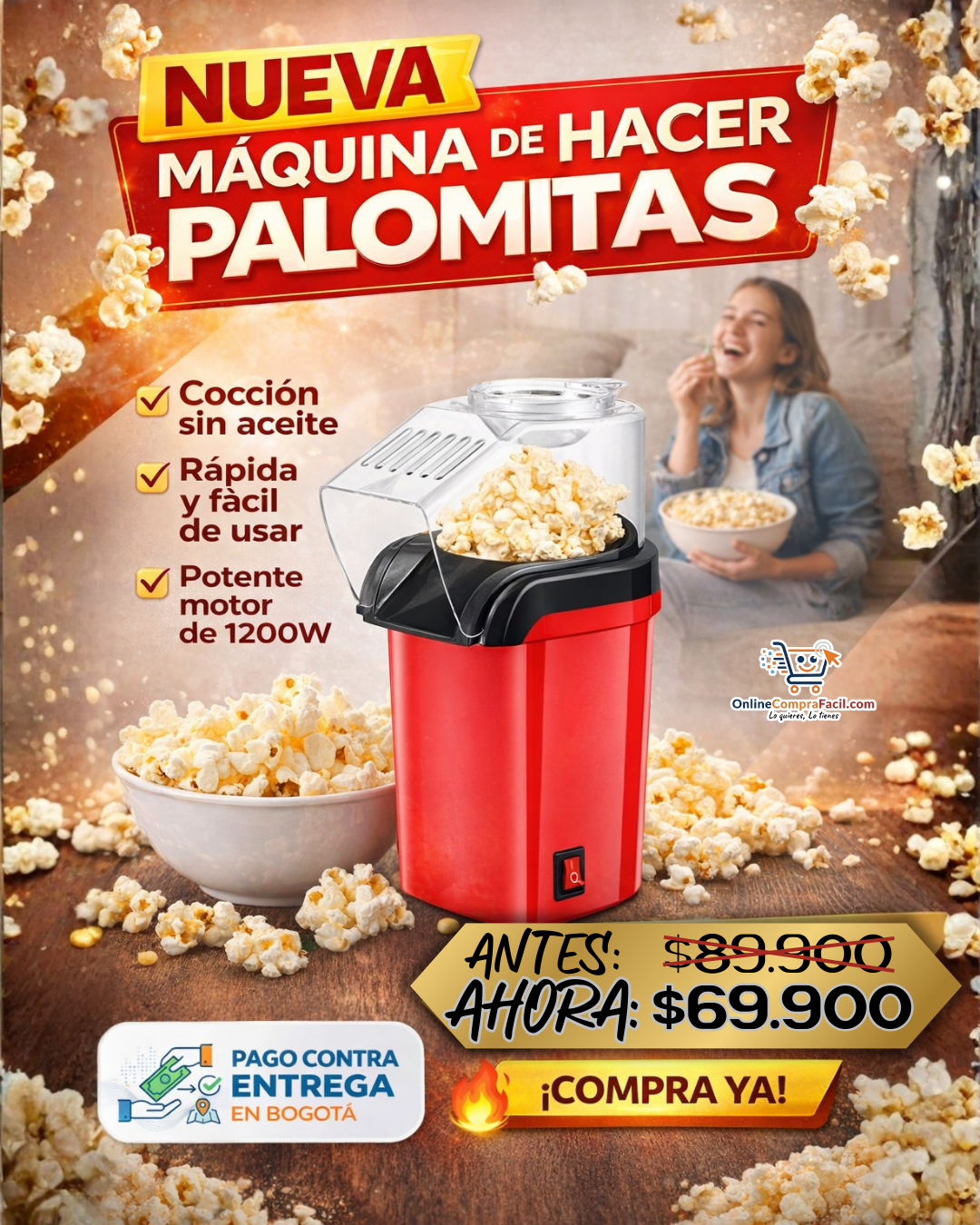 Prepara deliciosas palomitas de maíz de forma rápida y sencilla desde casa. Esta máquina está diseñada para ofrecer un calentamiento uniforme, logrando palomitas frescas y crujientes en minutos. Su uso es práctico y su diseño compacto la hace ideal para disfrutar en cualquier momento.